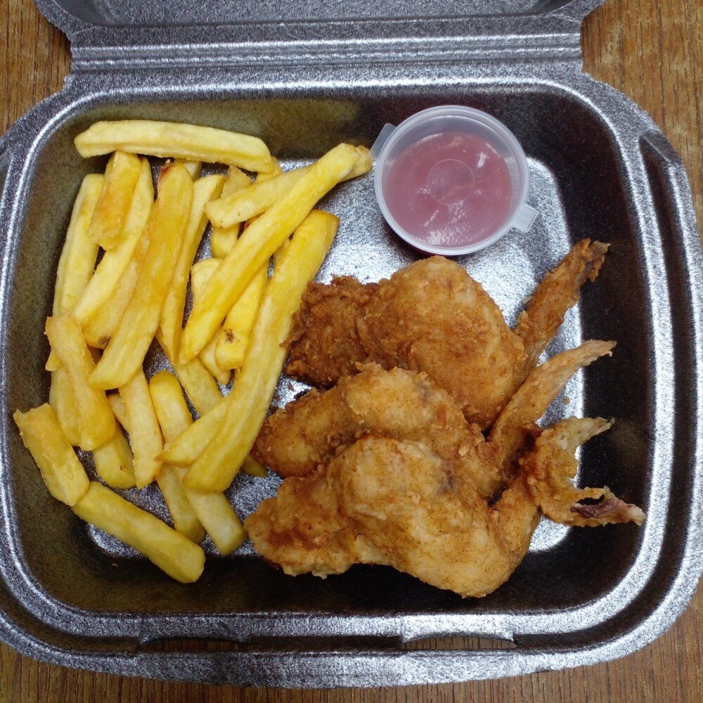 Картофель фри, крыло (3 шт) или голень (1 шт), кетчуп.